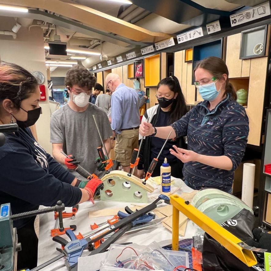 Fabrication of the final product took place at the end of the semester. In this photo our team is bending plywood sheets to make curved ramps.