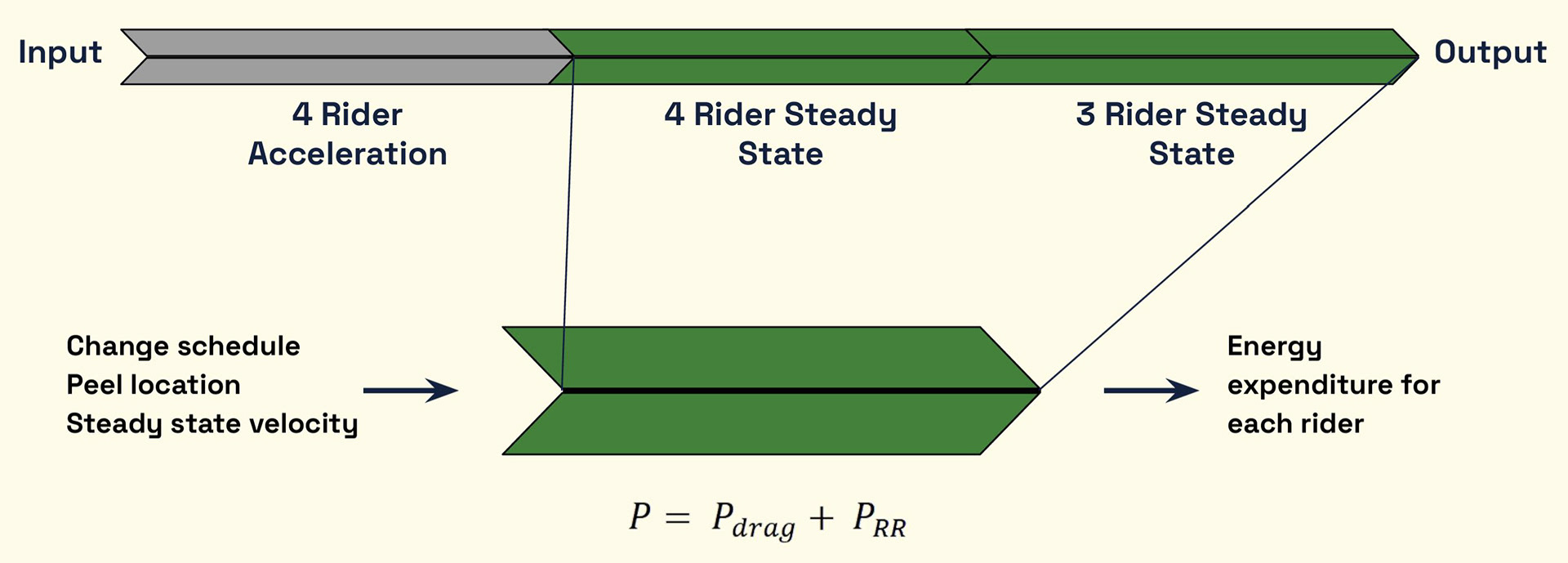 I primarily worked on modeling the steady-state phase and integrating the two phases. In the steady-state phase, the energy expenditure of each rider due to drag and friction can be computed as a function of their velocity.