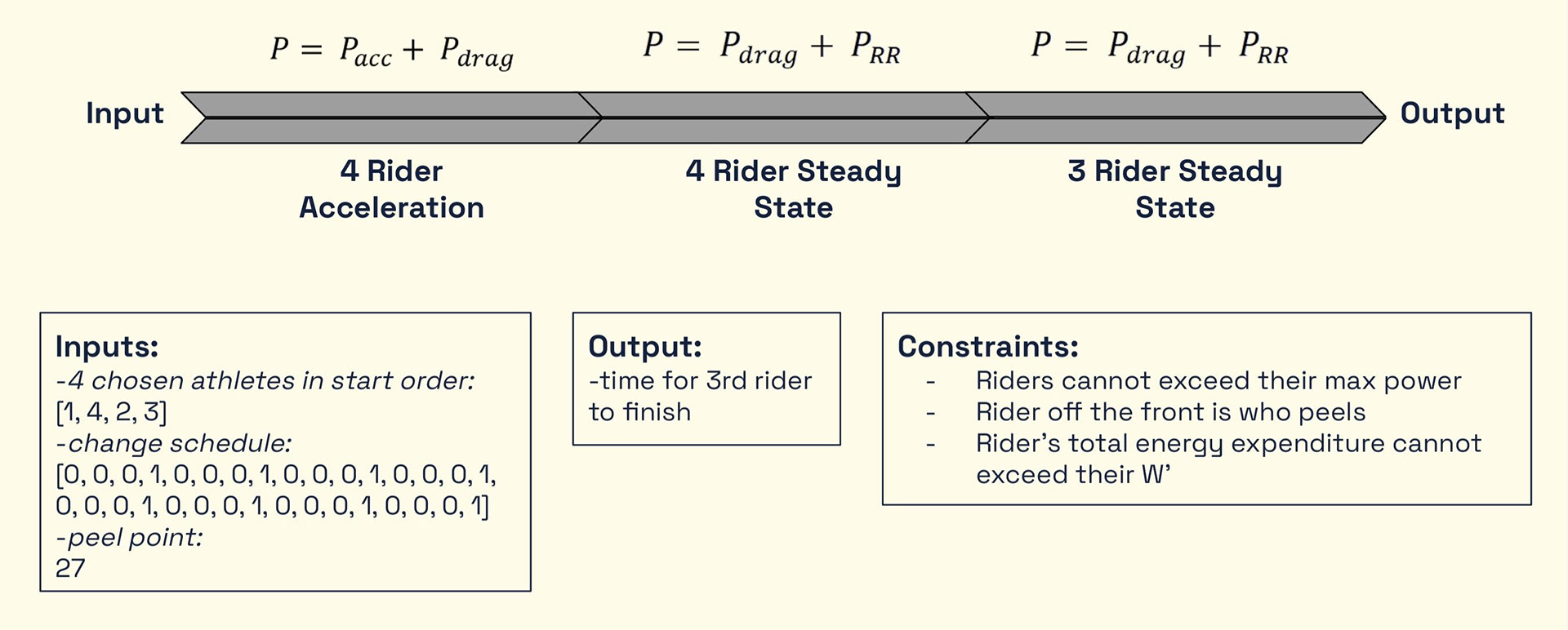 To simulate the outcome of a given race strategy, our model takes in the order of the riders at the start of the race, which points in the race their order changes, and at which point one of the riders drops off. We also divide the race into an acceleration phase, in which the riders ramp up to their target velocity, and a steady-state phase, in which we assume the riders maintain a constant velocity for the remainder of the race.