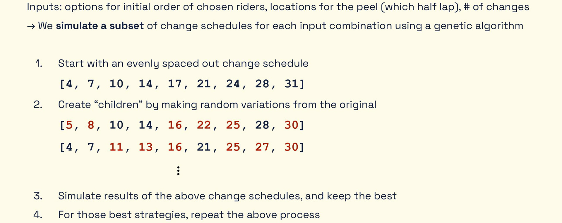 Once we were able to simulate a given race strategy, we used a genetic algorithm to build a method that finds an optimal strategy.