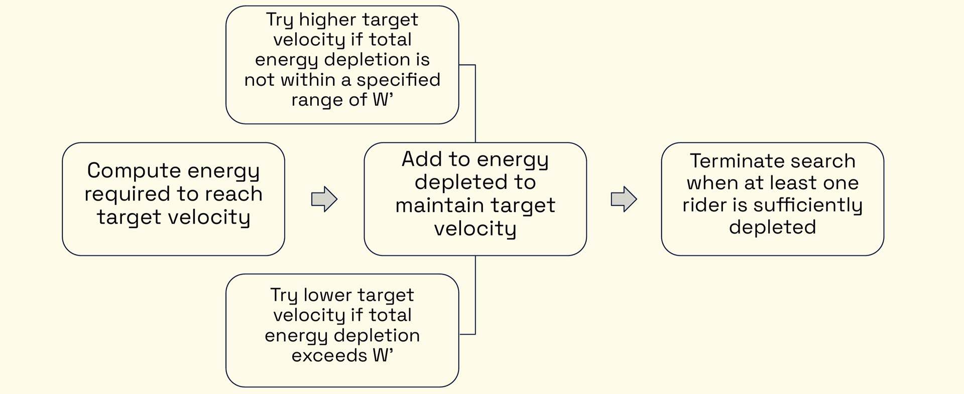 To find the highest steady-state velocity that can be maintained for a given strategy, we perform a bisection search over a range of possible velocities until we find one that depletes at least one rider close to their maximum amount, but does not deplete any rider beyond that threshold.