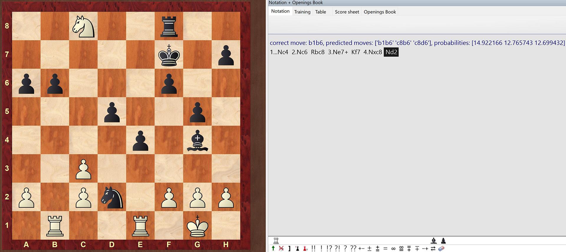 Maia Chess is trained on positions from players of a specified rating (in this case 1100) from the website Lichess. During testing it receives the previous eight moves as an input, and outputs the probability that each move is played. I converted that information to a PGN so the strengths and weaknesses of the model could be more easily understood.